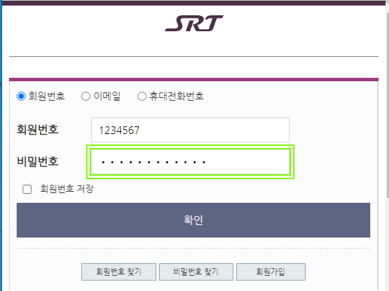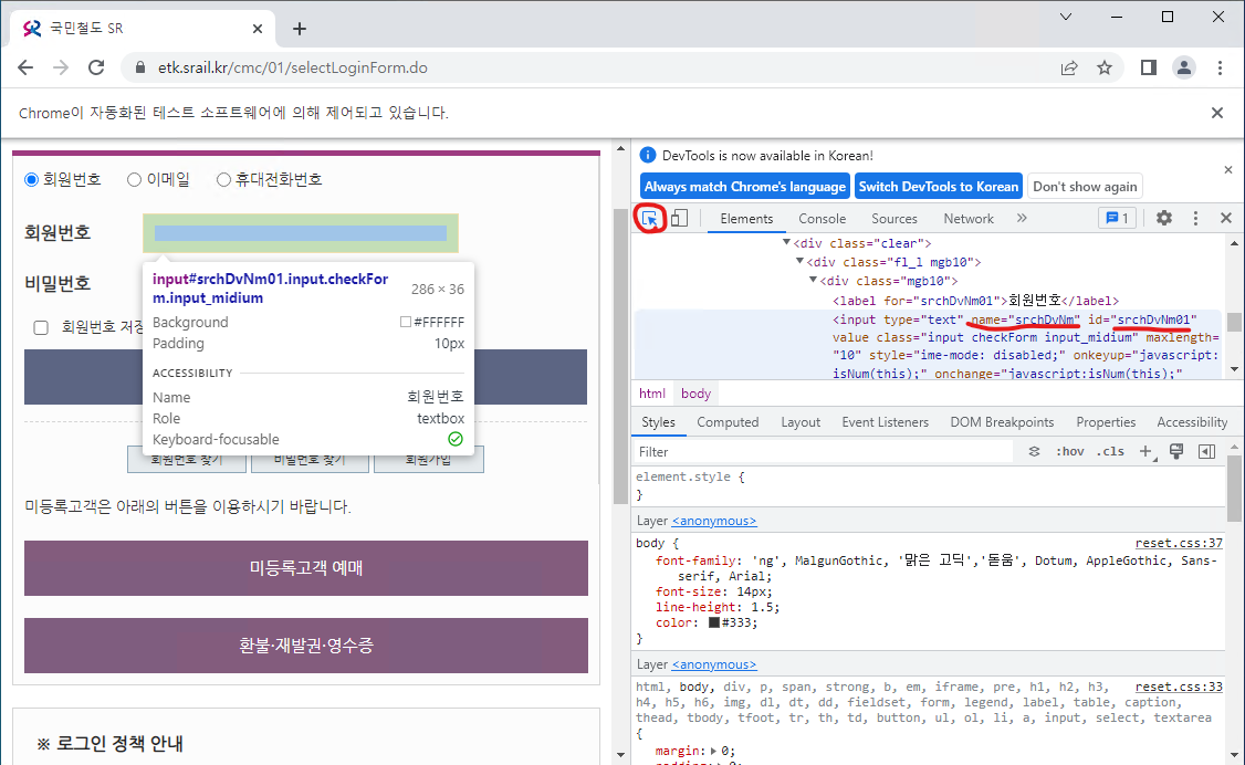 개발 툴 왼쪽 위에 네모위에 방향키를 클릭하고 실제 입력할 회원번호와 비밀번호에 위치를 확인합니다.